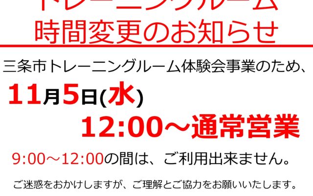 【トレーニングルーム営業時間変更】のお知らせ(11月5日)