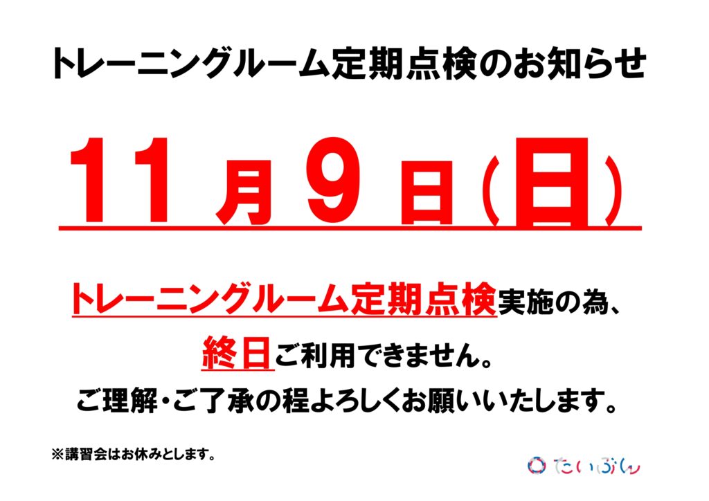 Information 現在の位置:ホームInformationお知らせ【トレーニングルーム定期点検日】のお知ら… 【トレーニングルーム定期点検日】のお知らせ(11月9日) 2025年10月22日 更新 お知らせトレーニングルーム 11月9日(日)はトレーニングルーム定期点検実施の為、終日ご利用できません。新規講習会も休止となります。 ご理解・ご了承の程よろしくお願いいたします。 Information一覧へ