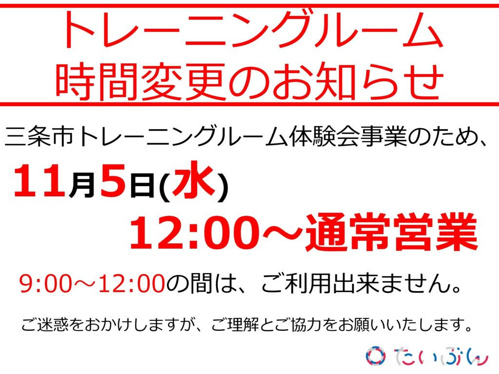 三条市トレーニングルーム体験会事業のため、11月5日(水)は12:00~通常営業となります。