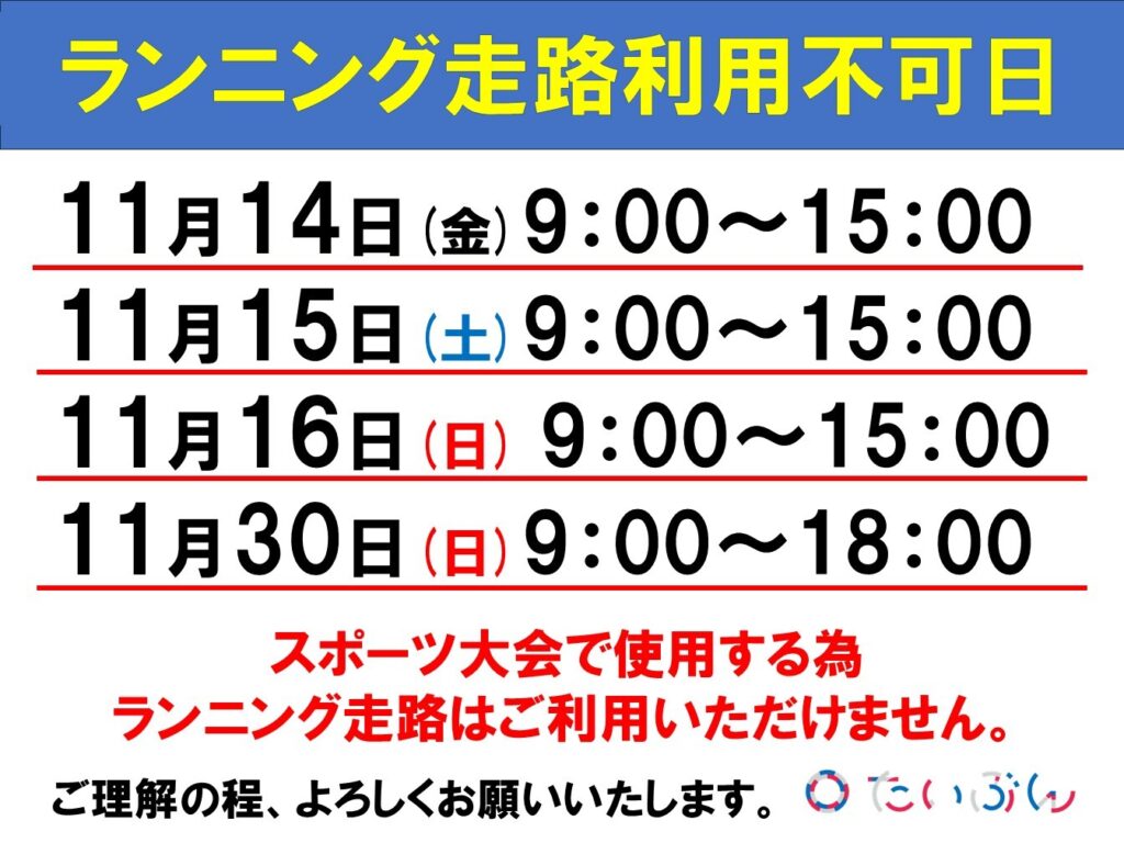下記の日程はスポーツ大会の為、ランニング走路をご利用いただけません。