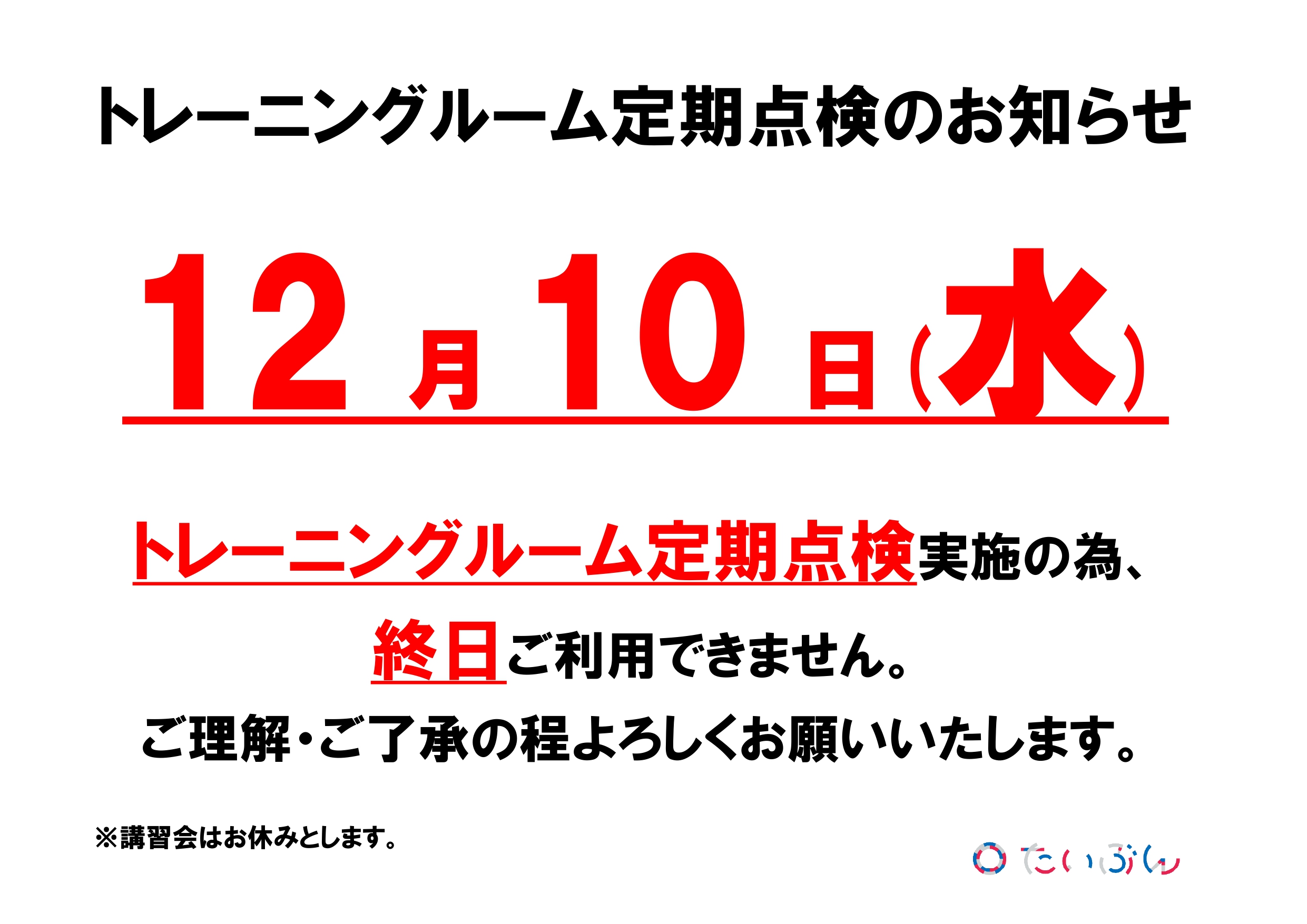 Information 現在の位置:ホームInformationお知らせ【トレーニングルーム定期点検】のお知らせ… 【トレーニングルーム定期点検】のお知らせ(12月10日) 2025年11月24日 更新 お知らせトレーニングルーム 12月10日(水)はトレーニングルーム定期点検実施の為、終日ご利用できません。新規講習会も休止となります。 ご理解・ご了承の程よろしくお願いいたします。 Information一覧へ