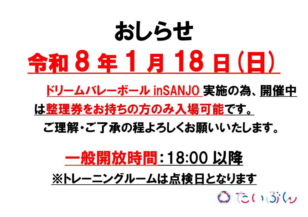 1月18日(日)はドリーム・バレーボール in SANJO実施の為、開催中は整理券をお持ちの方のみ入場可能です。