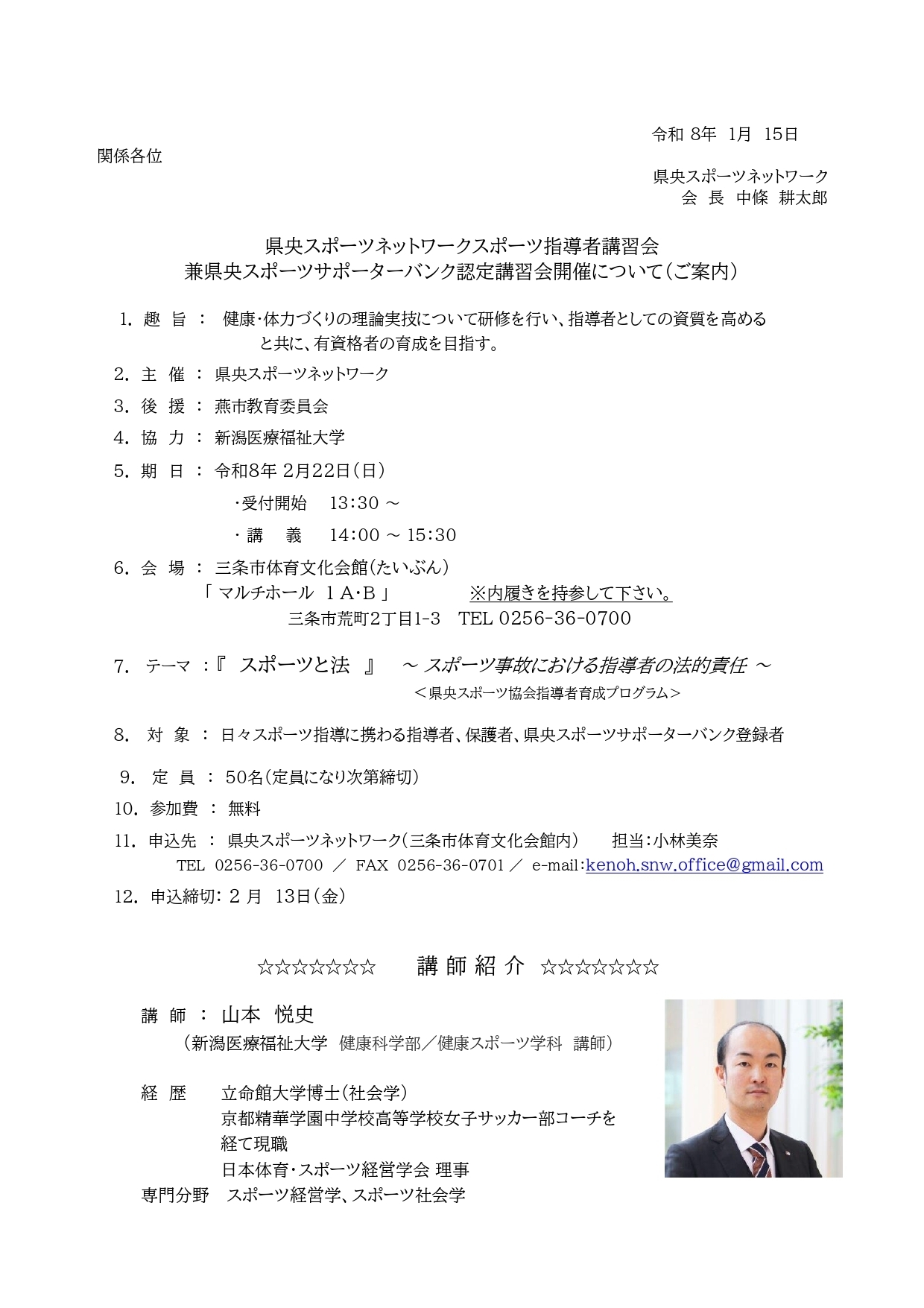 【県央スポーツネットワークスポーツ指導者講習会兼県央スポーツサポーターバンク認定講習会開催について】(2月22日)