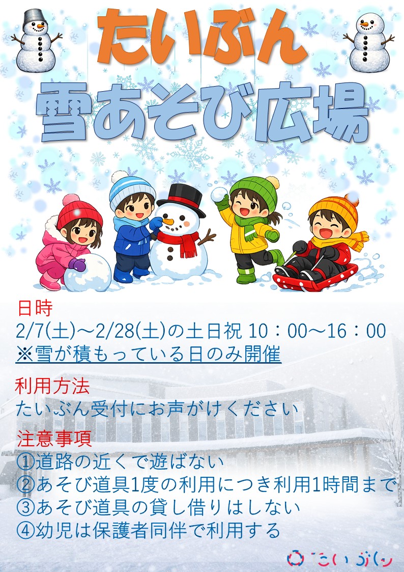 2/7(土)~2/28(土)の土日祝に「たいぶん雪あそび広場」を開催します!(雪が積もっていない日は開催しません)